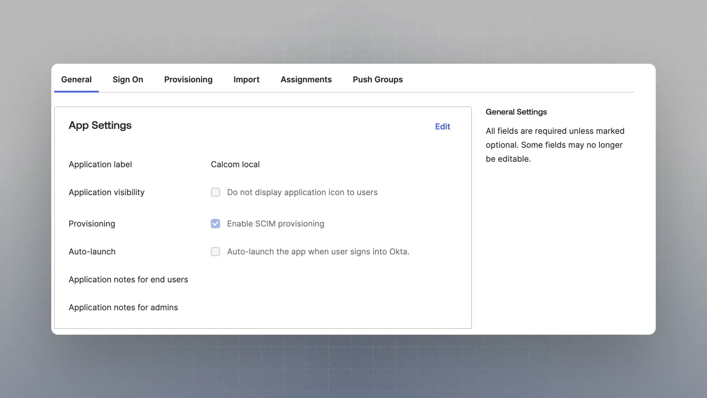 Once the application is created, under General -> App Settings, click “Edit” and then the checkbox “Enable SCIM provisioning”.