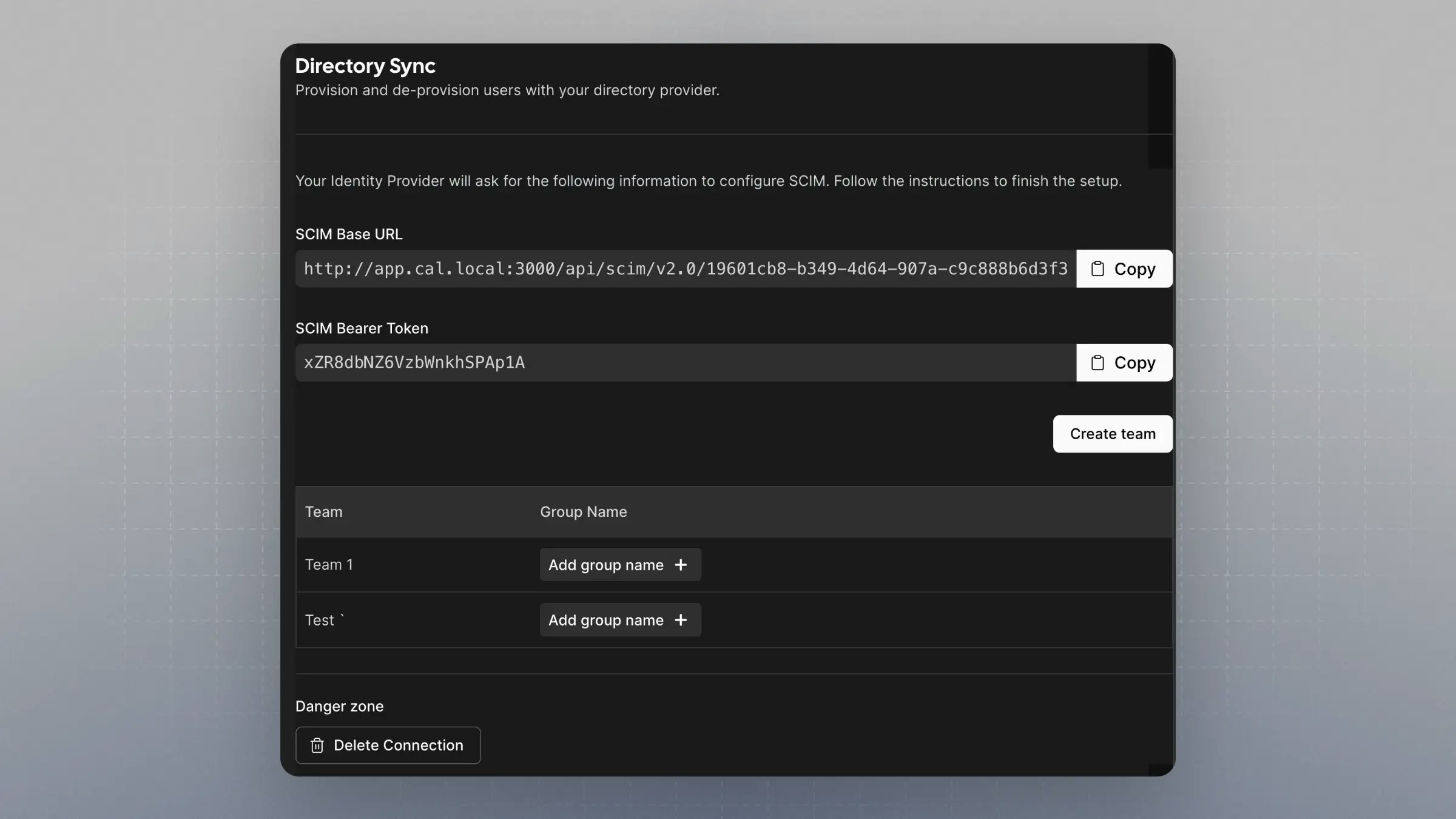- Under “Authentication” enter the “SCIM Bearer Token” from Cal.com