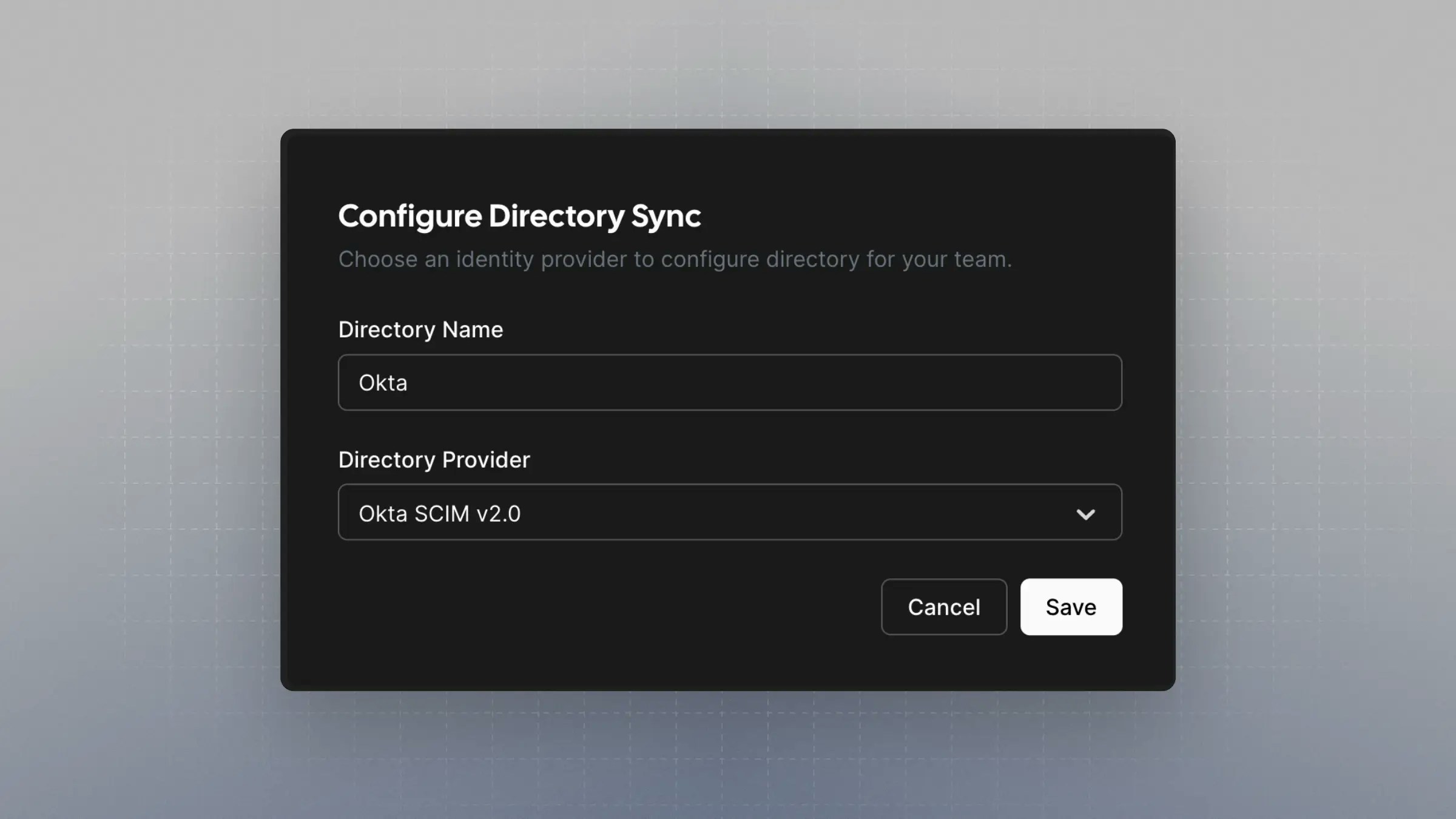 In the “Configure Directory Sync” form, choose a directory sync name and select “Okta SCIM v2.0” as the “Directory Provider”.