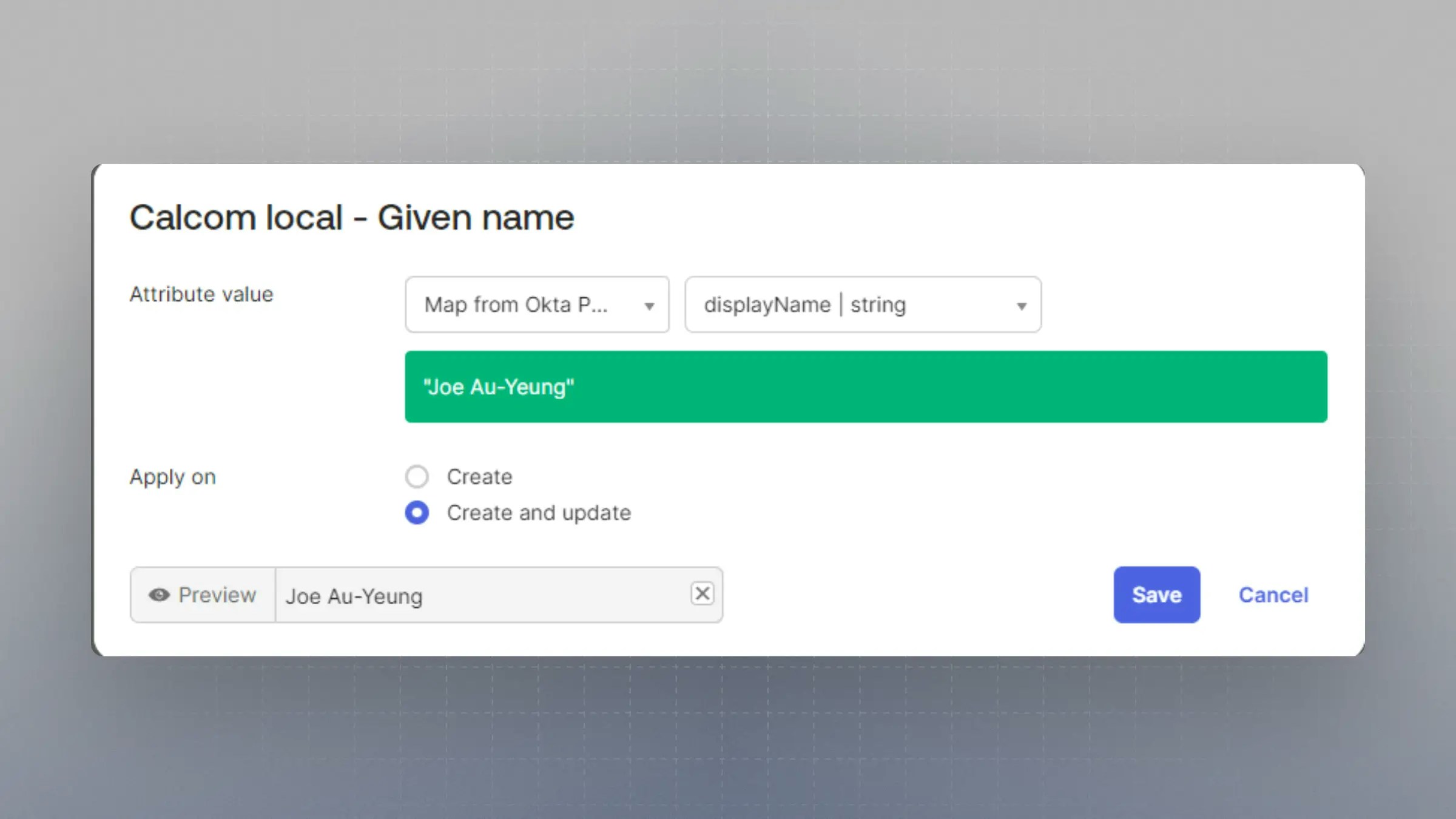 Set each of these properties to “Map from Okta Profile” and the related field. Under “Apply On” select “Create and Update”.